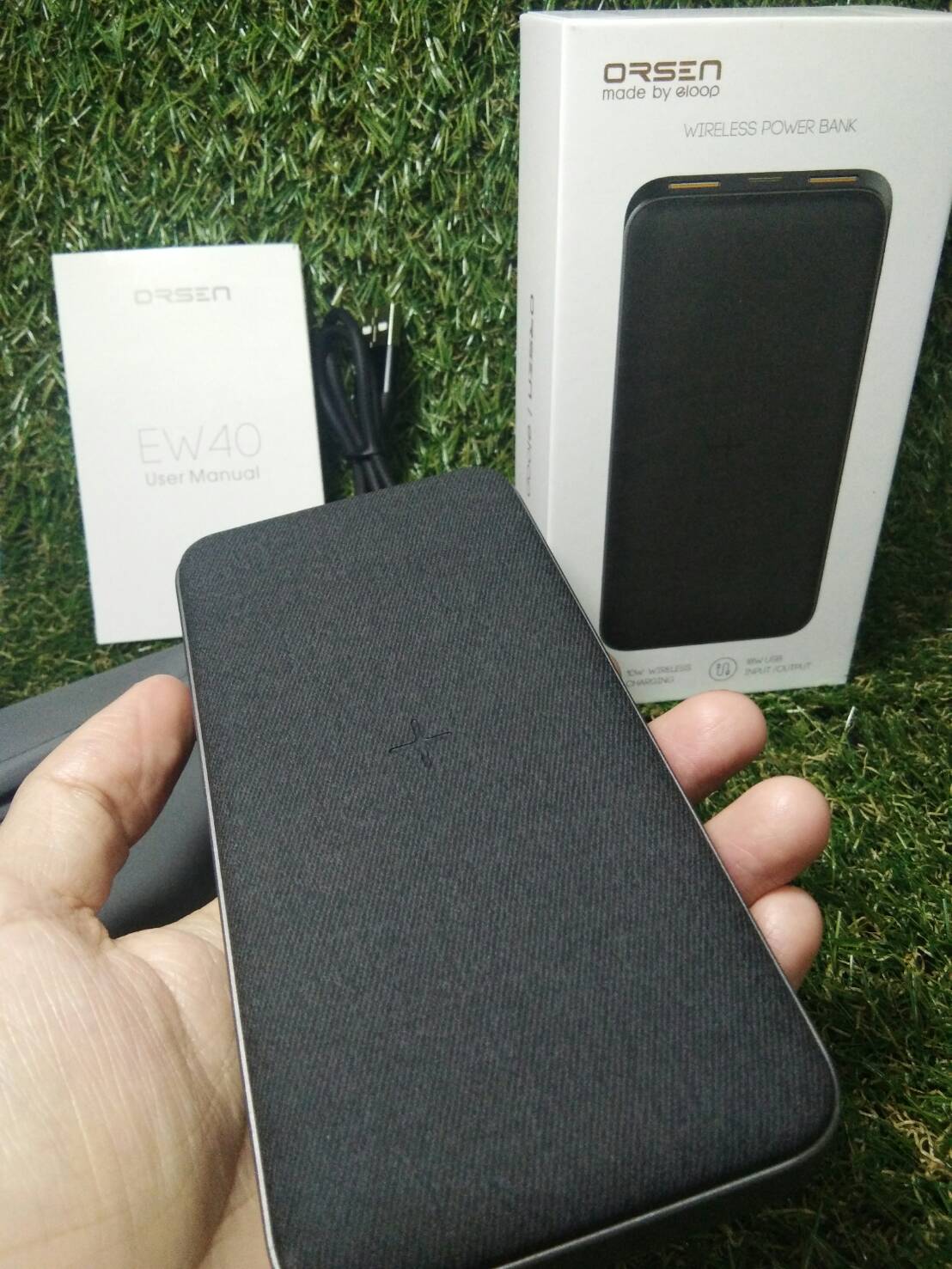 พาวเวอร์แบงค์ไร้สาย Eloop EW40 20,000mAh รุ่นนี้โดดเด่นคือรองรับการชาร์จไร้สาย สำหรับสมาร์ทโฟนที่มีเทคโนโลยีชาร์จไร้สาย เช่น iPhone8 -ขึ้นไป โดยจ่ายไฟได้ 5-10W สะดวกสบายไม่ต้องเสียบชาร์จเข้าที่เครื่องโทรศัพท์ ลดปัญหาพอร์ทชาร์จโทรศัพท์พังได้ 100%